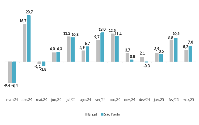 Segundo a Pesquisa Mensal do Comércio (PMC), do Instituto Brasileiro de Geografia e Estatístifa (IBGE), o volume de vendas do comércio paulista de material de construção contou com uma elevação de 7,0% em março, quando comparado ao mesmo mês do ano anterior. Este foi o terceiro desempenho mensal seguido com resultado positivo do setor no Estado de São Paulo que agora marca uma evolução acumulada de 6,9% no primeiro trimestre do ano, também em comparação com o mesmo período de 2024. No país e, em março, a variação ficou também positiva, com crescimento de 5,2% no mês, o que colaborou para o aumento acumulado de 6,3% nos três primeiros meses de 2025.