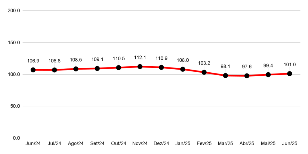 A pesquisa também apontou queda expressiva na confiança das grandes empresas, que atingiu o menor patamar desde setembro de 2020. O ICEC desse grupo caiu 9,6% em junho, com destaque para o recuo de 12,7% no IEEC e de 10,9% no ICAEC. Já entre os pequenos negócios, a confiança cresceu 1,9%, retornando à zona de otimismo.