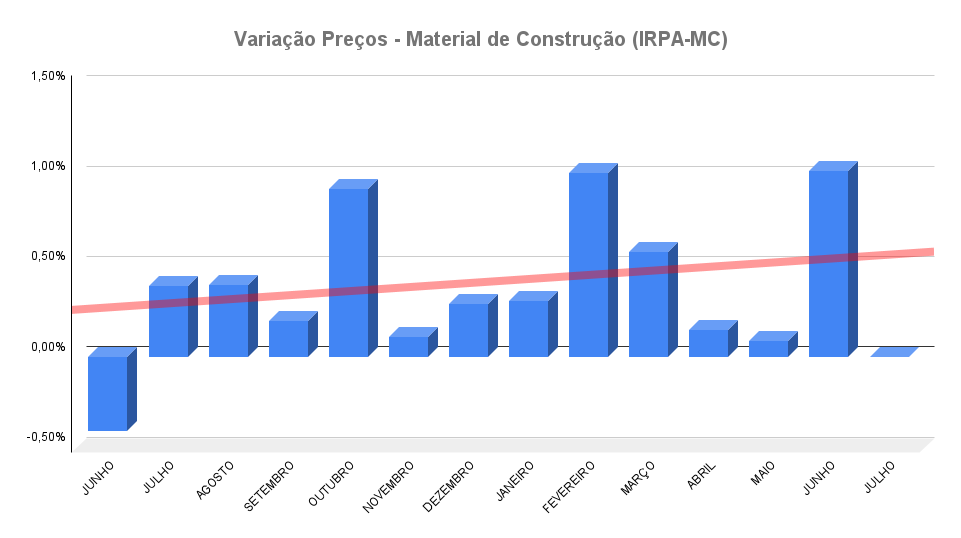 Não houve alteração significativa na média dos preços do varejo de material de construção em julho, conforme dados coletados pelo Índice Azure de Reajuste de Preço de Venda – Material de Construção (IRPA-MC). Depois de atingir a maior variação de 2025 em junho, com 1,03%, o indicador contou no mês passado com um aumento de 0,0074%.