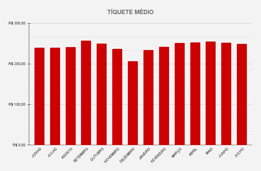 Por fim, os dados da Azure mostram um recuo em julho no tíquete médio do setor, que caiu para o nível mais baixo dos últimos quatro meses, com R$249,50. Apesar da queda verificada em relação ao mês anterior (R$252,20), o desempenho se manteve superior às médias dos últimos doze meses (R$244,33) e do ano passado (R$235,25).