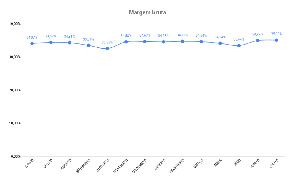 A margem bruta sofreu um pequeno acréscimo no período, ultrapassando pela primeira vez no ano a casa dos 35%. A última vez que tal fenômeno ocorreu foi em dezembro de 2023.