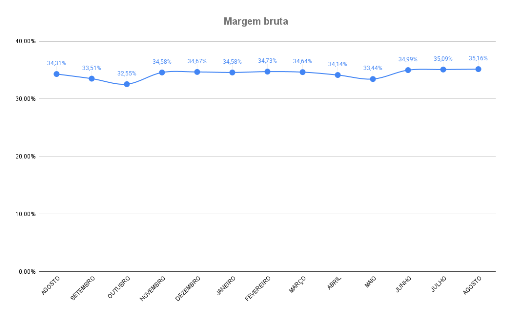 A margem bruta teve uma pequena variação positiva em agosto e chegou aos 35,16%, o nível mais alto do ano e superior à média do ano passado, 34,11%, o que certamente deve ter influenciado os resultados do faturamento.