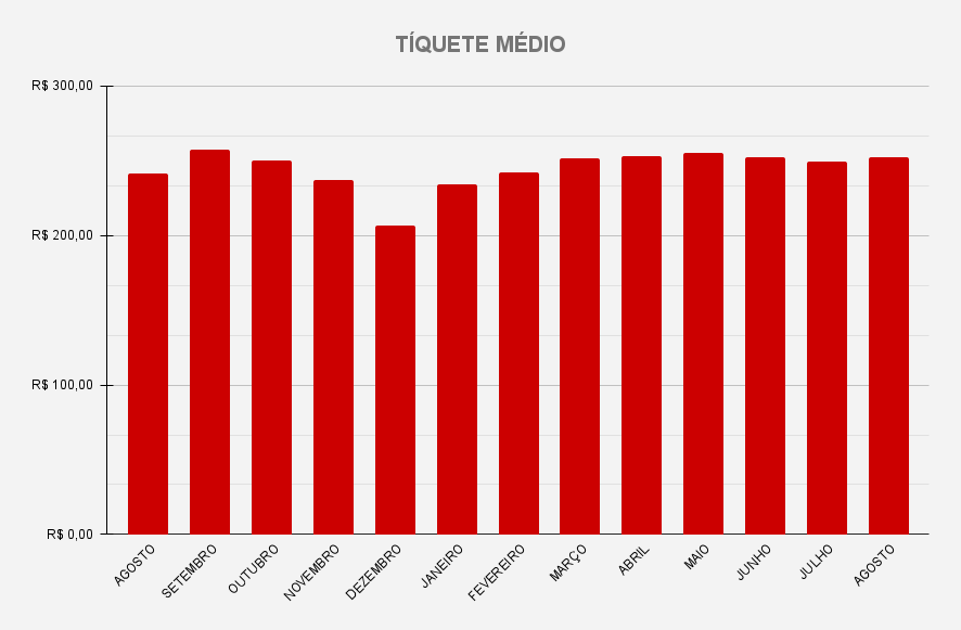 Para finalizar, o tíquete médio do setor em agosto alcançou os R$252,32. Esse patamar supera à média dos últimos doze meses (R$245,21) e do mesmo período do ano passado (R$241,71).