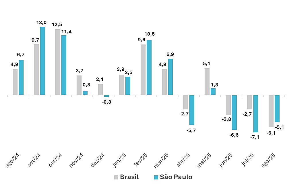 Com isso, a perspectiva é de queda nas vendas em São Paulo para 2025, reforçada agora também pelos dados de agosto. “Tendo como referência a alta do ano anterior, o setor segue o movimento de desaceleração da própria economia brasileira”, avalia. “Como é dependente do crédito e enfrenta juros altos (pessoas físicas e jurídicas), além de altos endividamento e inadimplência, este é um dos ramos comerciais que são mais rapidamente e fortemente impactado por variações mais significativas do consumo das famílias e dos níveis de investimentos empresariais. E é o que ocorre negativamente nos últimos meses, sem muita perspectiva de mudanças no curto prazo”, finaliza.