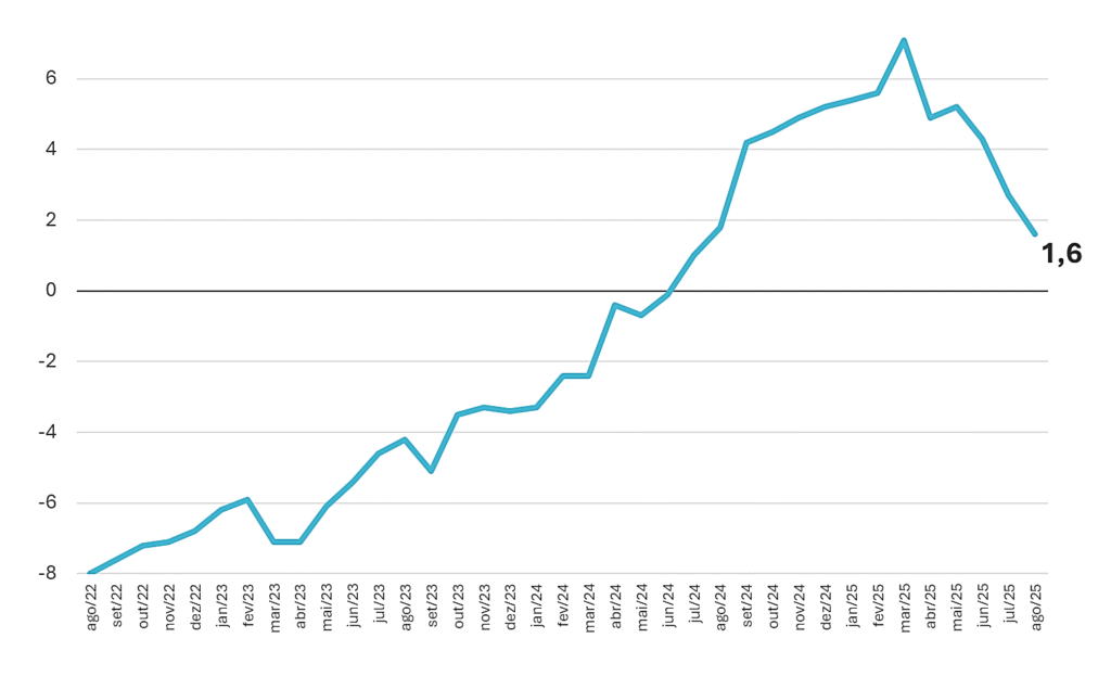 “É importante frisar que devido a esta nova retração, quando observamos o desempenho das vendas acumuladas nos oito meses do ano, que pela primeira vez em 2025 há um desempenho negativo em São Paulo, mais precisamente de -0,6%”, ressalta o economista Jaime Vasconcellos. Ele destaca ainda que no Brasil ocorreu avanço de 0,7%, mas com trajetória decrescente desde maio passado: “Devido a esta tendência, vemos que no desempenho acumulado em 12 meses deste indicador de performance do segmento há um aumento de apenas 1,6% nas vendas do comércio de material de construção paulista, que está, inclusive, em processo de descenso desde março de 2025”.
