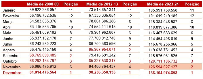 Dados da Entidade indicam que, entre 2008 e 2009, novembro apresentava receitas inferiores às registradas em meses tradicionalmente fortes para o consumo, como julho e outubro, além de períodos sem datas comemorativas. O cenário começou a mudar a partir de 2012 e 2013, quando a consolidação da Black Friday levou o mês ao quarto lugar em desempenho, com faturamento de R$ 84,4 bilhões. Na média de 2023 e 2024, novembro alcançou a vice-liderança entre os meses do ano.