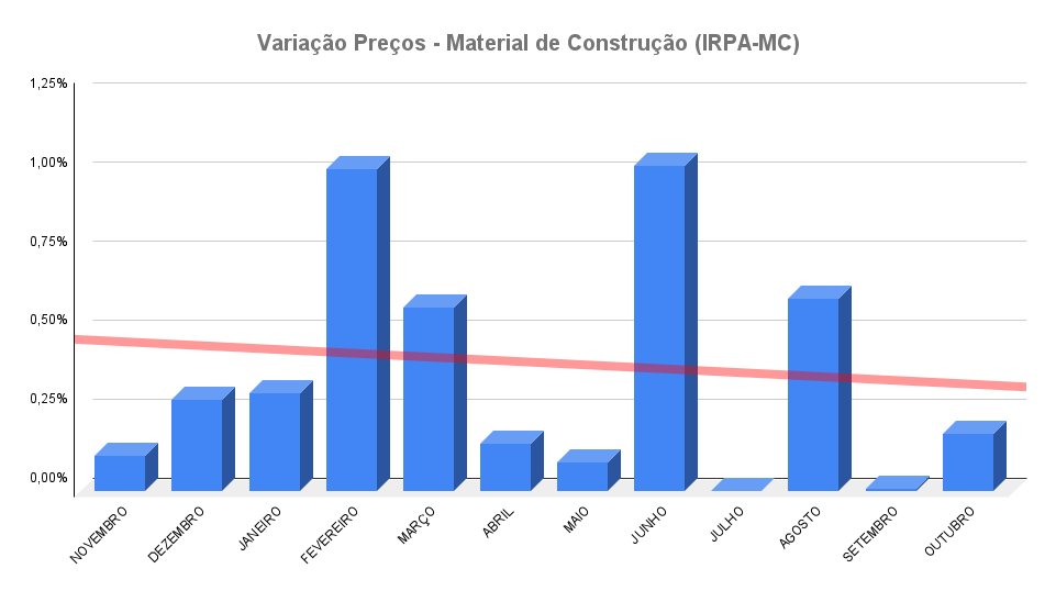 Depois da estabilidade apresentada em setembro, quando contou com uma elevação de apenas 0,0061%, o Índice Azure de Reajuste de Preços de Venda – Material de Construção (IRPA-MC) sofreu uma elevação de 0,18% em outubro. No mesmo mês do ano passado, o aumento se mostrou bastante superior: 0,93%.
