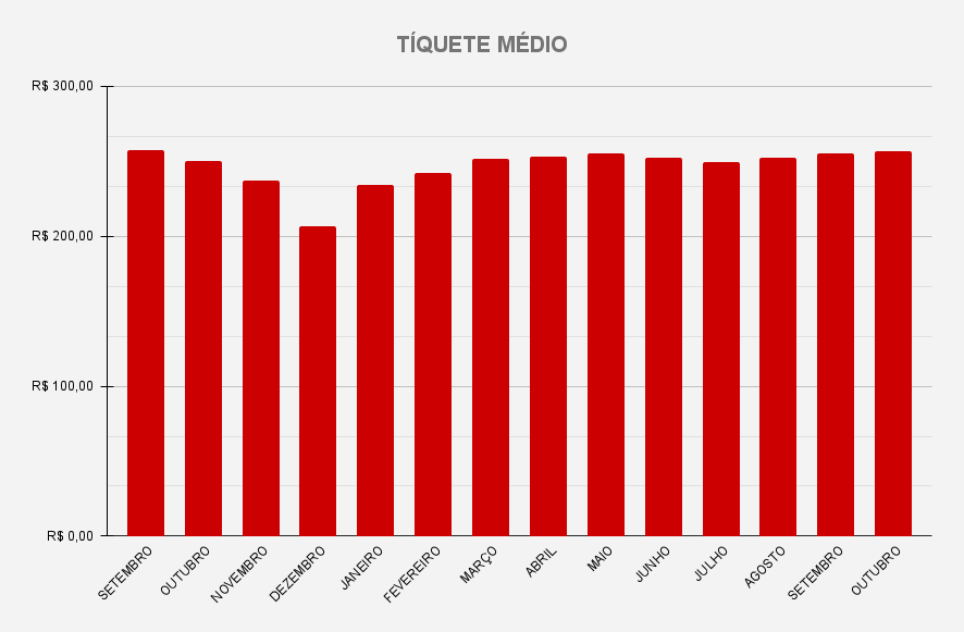 Já o tíquete médio contou com uma pequena variação positiva ao passar de R$255,26, em setembro, para R$256,57, em outubro. Apesar da diferença ser de apenas R$1,31, o valor alcançado é o segundo mais alto registrado pelo estudo, perdendo somente para setembro de 2024, com R$257,35.