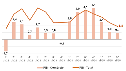 E o consumo tem dificuldades pois, com o objetivo de combater a inflação, vivenciamos um cenário de juros elevados que encarece o crédito e dificulta manter mais controlados os níveis de endividamento e inadimplência das famílias. Por isso era esperada esta desaceleração da economia brasileira, conforme foi plenamente percebido nestes resultados do 3º trimestre. E o comércio, mais sensível a este consumidor final, desacelerou ainda mais intensamente que o PIB.