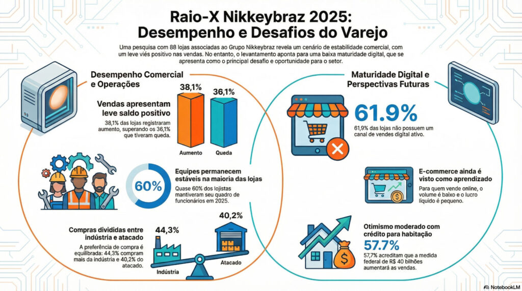 Levantamento do Grupo Nikkeybraz com 98 lojas associadas indica um ano de 2025 com leve saldo positivo no desempenho comercial: 38,1% das lojas registraram aumento de vendas, 25,8% mantiveram o nível e 36,1% tiveram queda. A diferença entre alta e baixa é pequena, o que sugere um mercado ainda pressionado, mas sem sinal de retração generalizada.