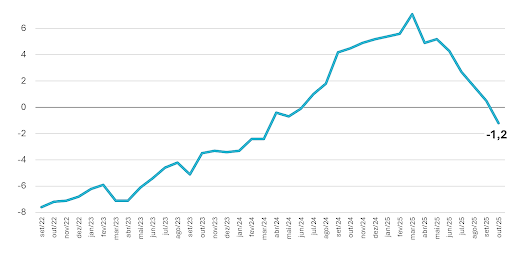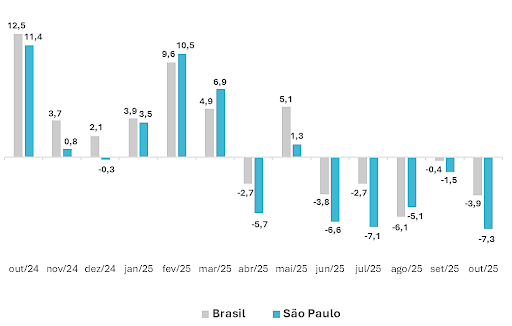 No acumulado de 2025, considerando o período de janeiro a outubro, é possível verificar que no Estado de São Paulo houve um recuo de 1,5% no desempenho do comércio de material de construção. Já em 12 meses, pela primeira vez desde os doze meses encerrados em junho de 2024, ocorreu também um resultado negativo no estado. Mais precisamente uma queda de 1,2%. No país, apenas como efeito de comparação, ainda há um avanço tímido de 0,6% neste último indicador, ainda que mês a mês tal ritmo venha diminuindo.