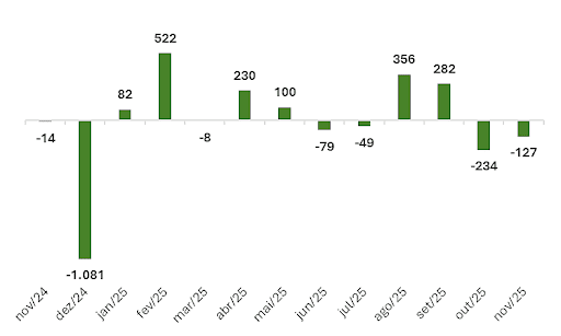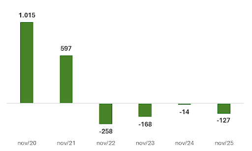 Nos últimos quatro anos o mês de novembro ficou marcado por saldos negativos de postos de trabalho, segundo o levantamento. A questão é que em 2025 tal redução se revelou bem mais aguda que a verificada em novembro do ano anterior, período no qual apenas 14 empregos haviam sido extintos.