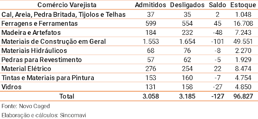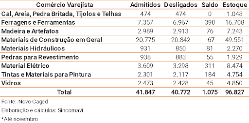 Dados do Novo Cadastro Geral de Empregados e Desempregados (Novo Caged) mostram que novamente o varejo de material de construção contou com redução do mercado de trabalho na Região Metropolitana de São Paulo (RMSP). Em novembro, foram 127 vagas a menos, após o registro de 3.058 admissões e 3.185 desligamentos. Em outubro já havia sido registrada uma redução de 234 vagas. Após tais resultados, o estoque ativo do setor atingiu 96,8 mil trabalhadores na Grande São Paulo.