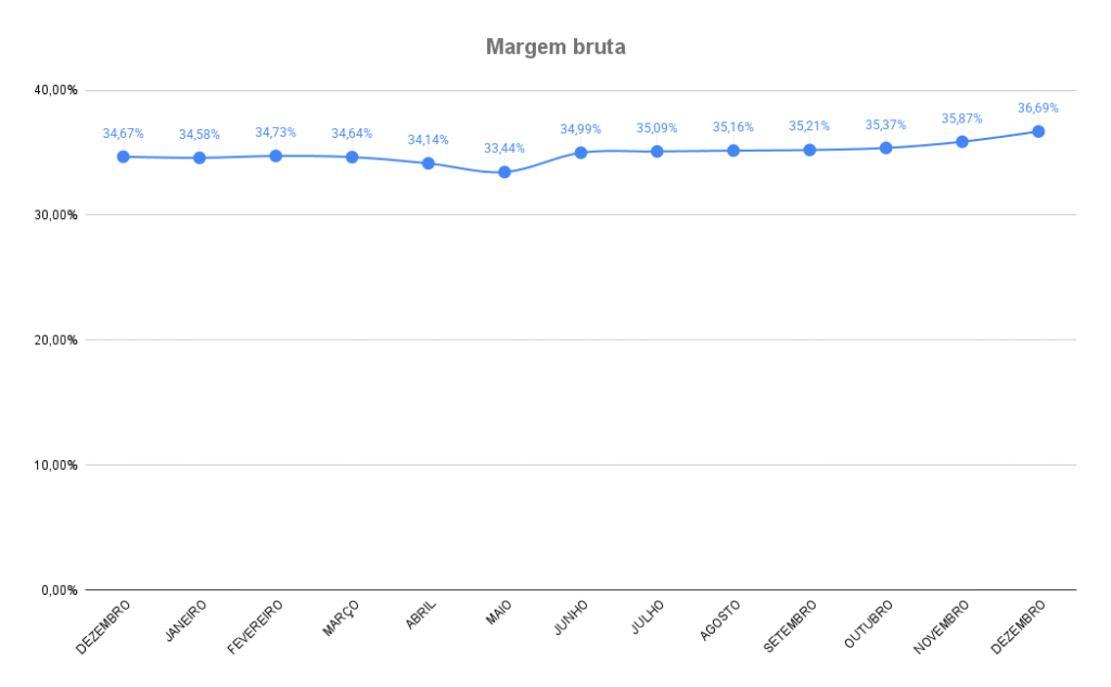 O estudo realizado pelo Sincomavi a partir de dados coletados pela Azure Sistemas em 432 lojas de pequeno e médio portes mostra ainda que a margem bruta registrou o oitavo aumento consecutivo em dezembro do ano passado. Tal movimento teve início em maio de 2025, saindo de 33,44% e atingindo os atuais 36,69%.