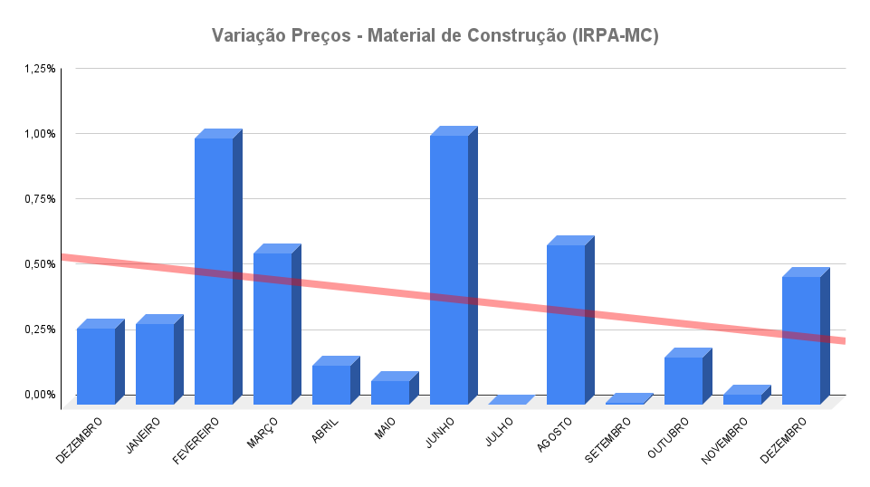 Após o aumento de 0,49% registrado em dezembro, o Índice Azure de Reajuste de Preços de Venda – Material de Construção (IRPA-MC) fechou o ano passado com uma elevação acumulada de 4,56%. O resultado se mostra superior ao verificado em 2024: 2,38%.