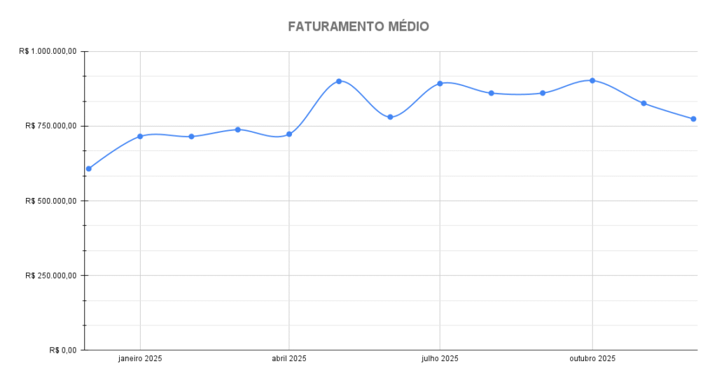O faturamento médio do setor caiu mais uma vez, a terceira queda consecutiva, e atingiu os R$774.123,00. Em novembro, o valor havia ficado em R$826.389,00. A média anual chegou aos R$807.031,00 – desempenho superior em relação a 2024, com R$703.064,00.