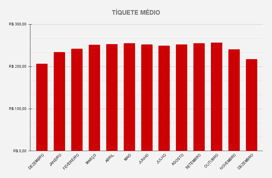 O tíquete médio também sofreu recuo no período analisado. Após registrar patamares de R$256,57 e R$241,07, em outubro e novembro, respectivamente, esse indicador caiu para 217,74 em dezembro. Em outras palavras, o valor mais baixo alcançado no ano passado, mas ainda superior ao obtido no mesmo mês de 2024 (R$206,57).