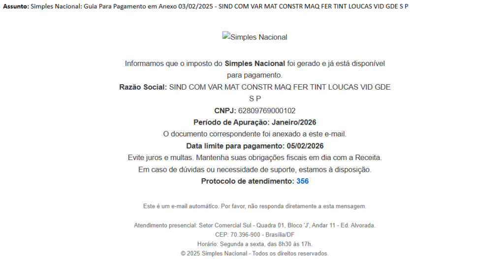 O Sincomavi alerta os comerciantes sobre a circulação de e-mails fraudulentos que simulam comunicações oficiais do Simples Nacional, informando a suposta geração de guia de pagamento e induzindo o destinatário a quitar valores indevidos. O material recebido apresenta linguagem formal, CNPJ correto e anexo com “guia”, estratégia comum utilizada por criminosos para enganar empresas.