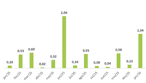 A variação mensal de 1,34% de janeiro de 2026 foi a maior desde junho do ano passado, período no qual ocorreu uma oscilação de 2,04%. Já em doze meses, o custo médio da construção civil paulista aumentou 6,50%, sendo 4,87% em razão da majoração do material de construção e 8,41%, da mão de obra.