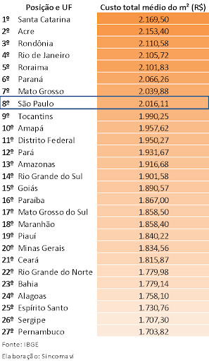 Por fim, Jaime destaca que o custo médio total do metro quadrado do Estado de São Paulo é o oitavo maior dentre as unidades da federação. A liderança é de Santa Catarina (R$2.169,50) e o menor valor fica com Pernambuco (R$1.703,82).