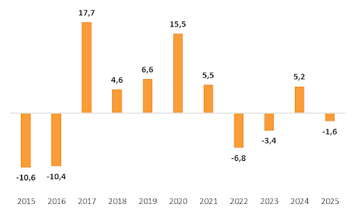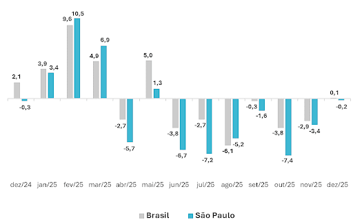 Os números ruins do setor na economia paulista, em especial na segunda metade de 2025, foi responsável para que no acumulado do ano o volume de vendas do comércio de material de construção apresentasse uma retração de 1,6%, segundo o IBGE. O resultado negativo contrapõe o aumento de 5,2% em 2024. No país, a queda anual foi mais amena, de 0,2%, também invertendo o cenário positivo do ano anterior, quando houve um aumento de 4,8%.
