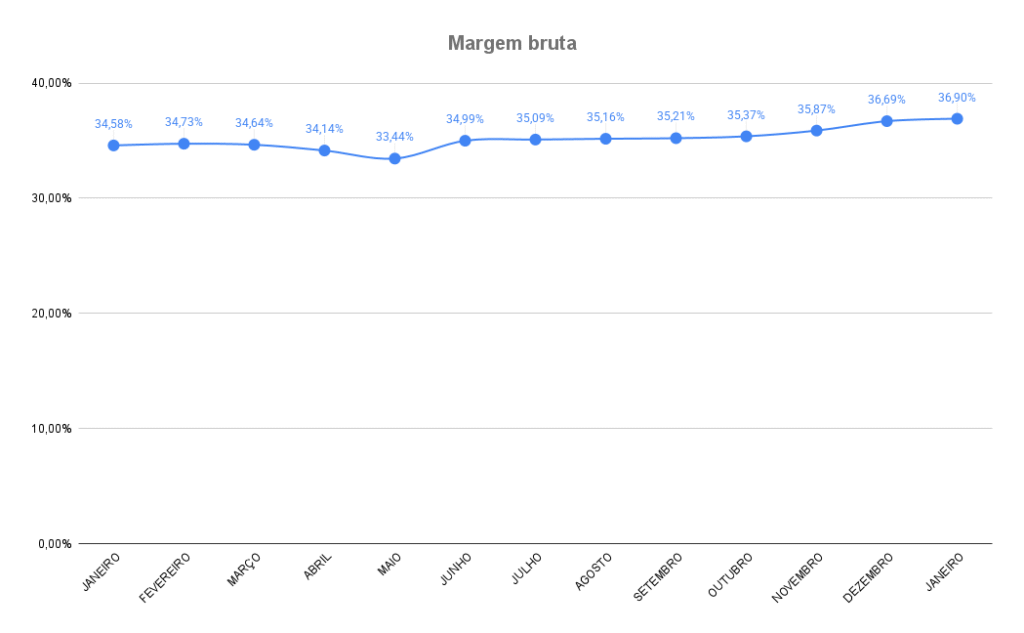 A margem bruta avançou mais um pouco no período e atingiu o maior nível já registrado pelo estudo: 36,9%. As médias de 2024 e 2025 foram, respectivamente, 34,11% e 34,99%.