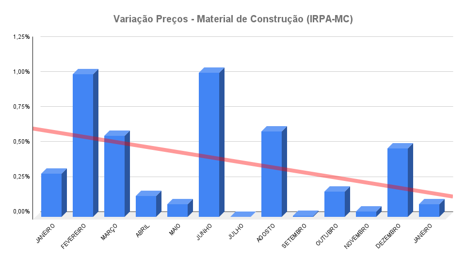 O Índice Azure de Reajuste de Preço de Venda – Material de Construção (IRPA-MC) começou o ano apresentando uma variação muito pequena, apenas 0,09% em janeiro. Essa estabilidade reafirma a clara tendência de queda na inflação setorial verificada nos meses anteriores e também radiografada pelo Índice Nacional da Construção Civil (Sinapi) que contou com um aumento de +0,14% nos preços na categoria “materiais de construção”. Esse movimento pode ser percebido ainda de maneira mais clara no no acumulado dos últimos doze meses. Com o resultado de janeiro, o IRPA-MC alcançou 4,34% de aumento – patamar abaixo do período imediatamente anterior, com 4,56%.