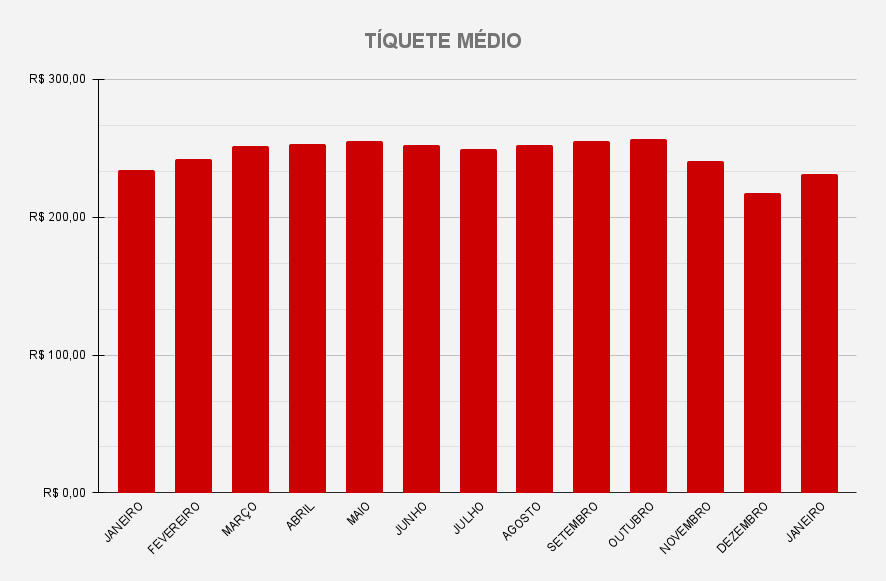 Por fim, o tíquete médio variou positivamente em janeiro e ficou em R$232,12. Esse patamar é superior a dezembro passado (R$217,74), mas inferior em relação ao mesmo mês de 2025: R$234,21.