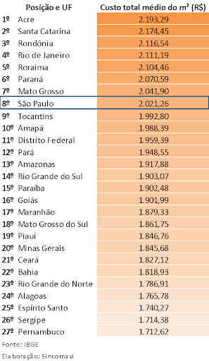 Por fim, Jaime ressalta que o custo médio total do metro quadrado do Estado de São Paulo segue sendo o oitavo maior dentre as unidades da federação. A liderança agora fica com o estado do Acre (R$2.193,29) e o menor valor se manteve com Pernambuco (R$1.712,62).