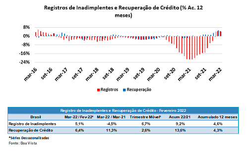 Foi divulgado ainda detalhes sobre a recuperação de crédito, que contou em março com aumento de 6,4%, tendo como referência o mês anterior, e 13,6% na comparação entre os primeiros trimestres de 2022 e 2021. No entanto, é feito um alerta, pois parte dessa recuperação também se deve ao aumento no fluxo de inadimplentes, que tem sido forte. “No entanto, livrar-se das restrições de crédito não elimina o risco de crédito, tanto que a projeção é de elevação na taxa de inadimplência ao longo deste ano”, segundo informações da Boa Vista.